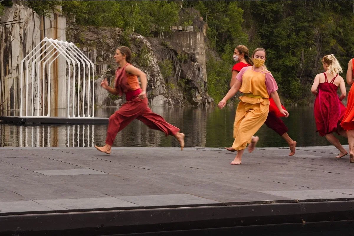 This house was made for a room in Winooski’s Woolen Mill where I presented my first public site piece, The Mill Project in 1995. My partner Dave Severance constructed this delicate skeleton onto which we pinned a skin of old sheets. It appeared again in an abandoned warehouse in The Bakery Project amongst wheat sheaves and grain, then “flew in” onto the Flynn Theatre’s main stage in Running Like Mad with our Eyes Closed in 1996. Since then, it has been in storage, though not forgotten. The quarry offered a lovely and haunting setting for this house that is only a fragment, a recollection, a house that cannot shelter. In the same way that the snow defines the edges of the quarry history, the bones of the house define the shape of a resonant and memory-filled space.
