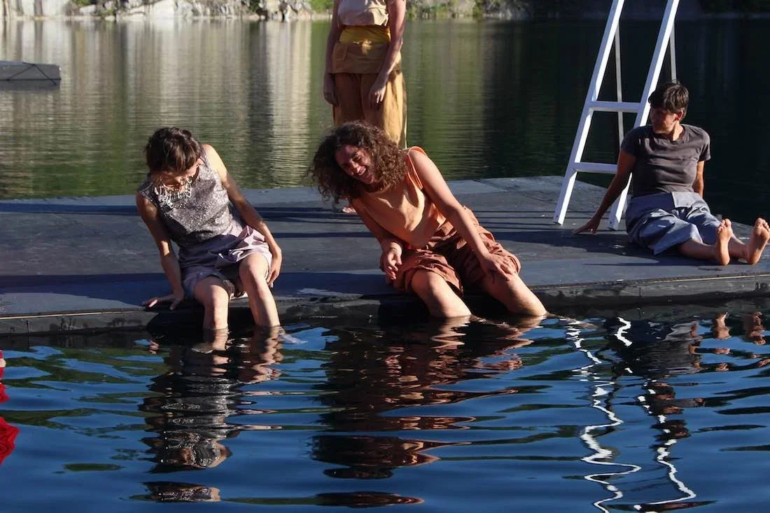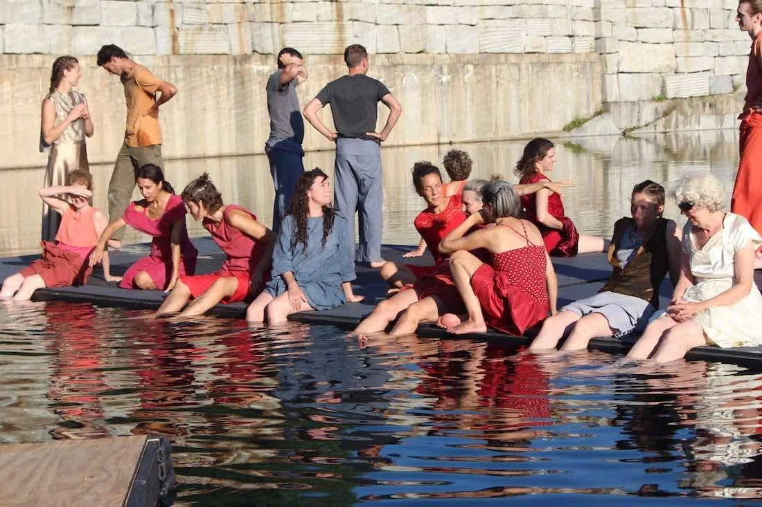 Arriving on Sunday August 18, the ensemble got right to work adapting to the watery world and rock walls of the quarry. They practiced moving the stages with the ropes that were strung across the quarry, moving through the water, pushing each stage apart and re-connecting them. They worked on spacing of both individual and ensemble dances as the band familiarized themselves with the sonic environment of the quarry. We finished that first day with each group running around their stage and “falling” into the water as a way to be comfortable with this ever-present element and make that “mistake” part of the scene.