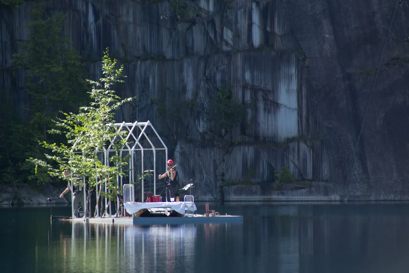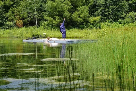 Here are two images - one from our July days with dancers on my neighbor’s pond; and one from our late August sonic/perspective/lighting test day in the quarry – and a short video, filmed and edited by Michael Fisher.