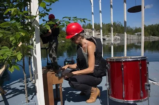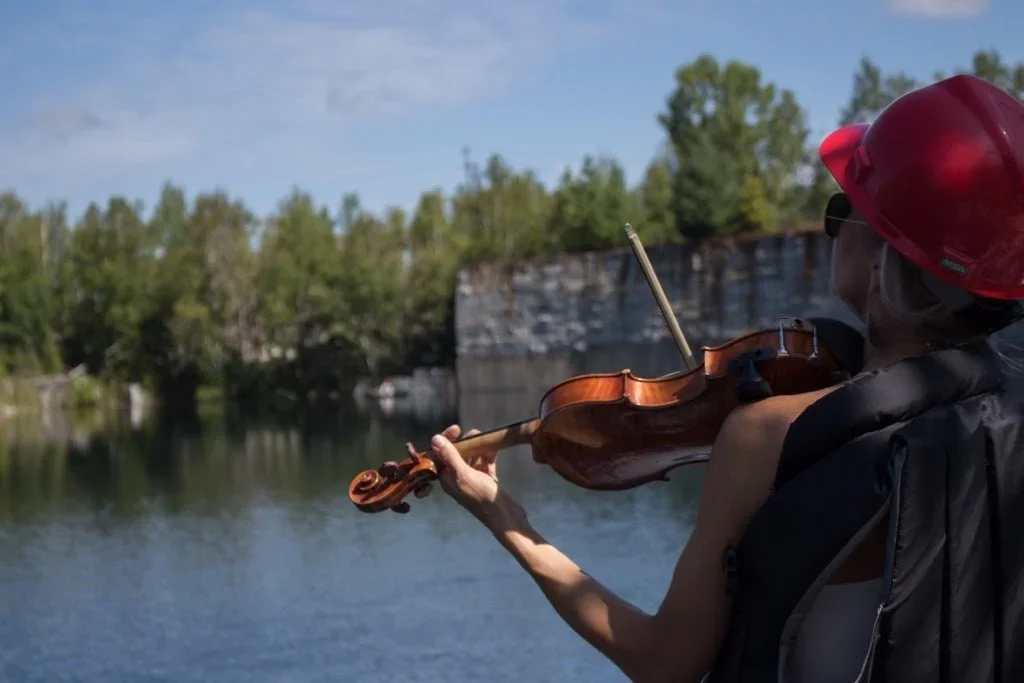 Here are Sofia and Andric on the stage in August, experimenting with sounds in the quarry. Just to give you some perspective, in the far distant right-hand corner of the photo, you can maybe see me sitting on the rock ledge, listening.